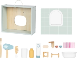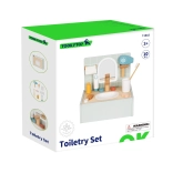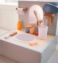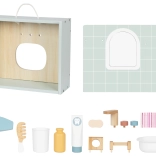 Træbadeværelset fra Tooky Toy er ideelt til børn fra 3 år. Det indeholder forskellige badeværelsestilbehør, der er designet til at motivere børn til at lære vigtige hygiejnevaner. Sættet indeholder: