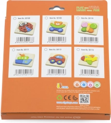 Hvert puslespil har en anden form – fly, mariehøne, bil og sommerfugl – hvilket styrker koordination og kognitive evner.