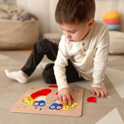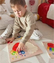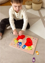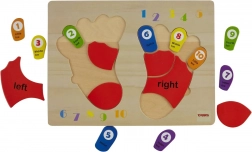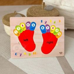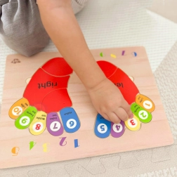 Træpuslespil fra mærket TOOKY TOY er ideelt værktøj for børn i deres første skridt ind i matematikkens verden. Tavlen og alle dens elementer er lavet af høj kvalitetstræ og er perfekt tilpasset størrelsen af børns fødder. De farverige spor er mærket med venstre og højre side, og hver finger har et tilknyttet tal, hvilket hjælper børn med at overføre den lærte viden til at tælle på egne fingre.