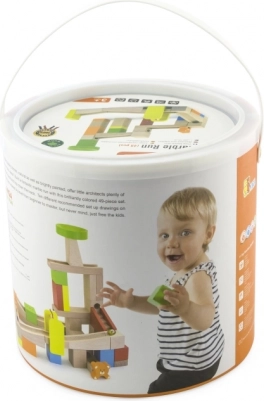 Pakken inkluderer en praktisk spand med hank for nem opbevaring og transport. Delene er fremstillet af kvalitetslakeret træ og farvet med ugiftige farver i markante nuancer. Legetøjet udvikler finmotorik, rumlig forestillingsevne, logisk tænkning og stimulerer kreativitet.