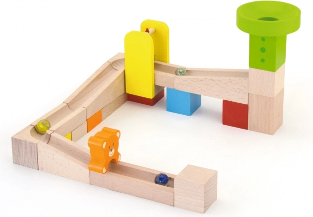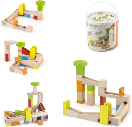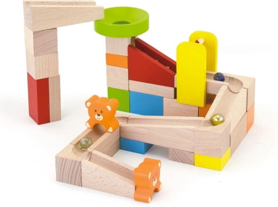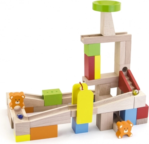 Byg din egen eventyrlige kuglebane af 49 robuste trædele, og se glaskuglerne suse ned ad baner og ramper. Sættet tilbyder kreativ byggeri, læring om årsag og virkning og udvikling af motorik. En praktisk spand med hank gør opbevaring og transport let. Farverige, glatte dele af sikkert lakeret træ og legende elementer (trapper, bjørne) vil glæde hvert barn.