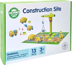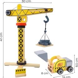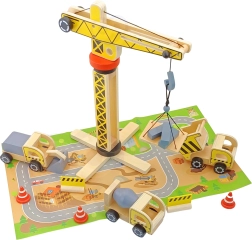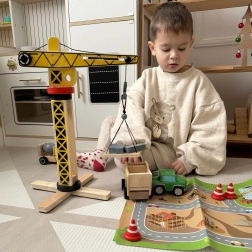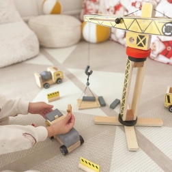 Det udvidede byggesæt fra WOOPIE GREEN er beregnet til små byggere. Dette sæt indeholder en stor trækran, tre byggepladskøretøjer og andet tilbehør til realistiske byggelege.