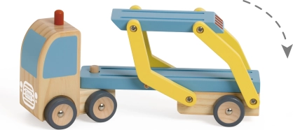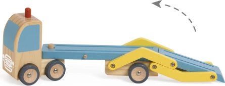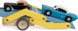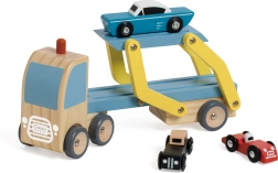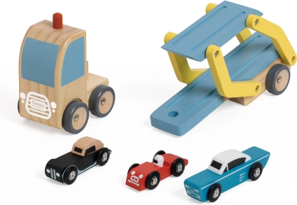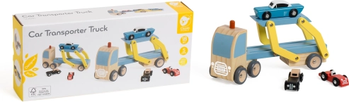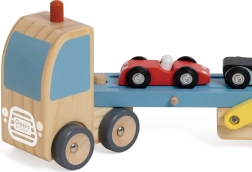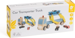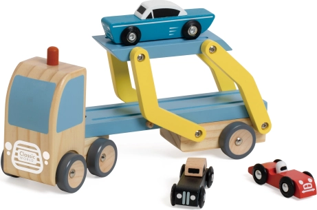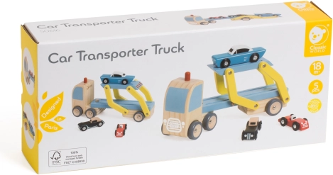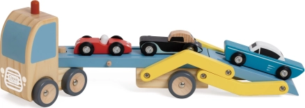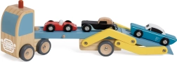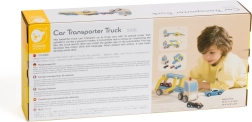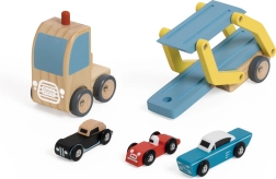 Den træbaserede biltransportør er det ideelle legetøj til børn fra 18 måneder. Dette kvalitets sæt i træ inkluderer en lastbil med lad og tre farverige køretøjer, som let kan lastes og losses.