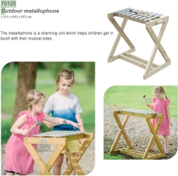 Oplev glæden ved musik under åben himmel. Den robuste træramme og metal-tangenterne sikrer en ren, resonant tone og lang levetid selv ved hyppig udendørs brug. Metallofonen er ideel til børnehaver, legepladser og private haver – børn træner koordination, hørelse og rytme og styrker samtidig deres selvtillid og mod til at fremføre deres egen melodi.