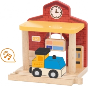 Udvid din trætogbane med en kompakt station med realistiske detaljer. Den robuste trækonstruktion, tydelig urskive og overdækning skaber en autentisk stationsstemning. Integrerede batterieffekter fremhæver hvert stop og styrker den interaktive leg.