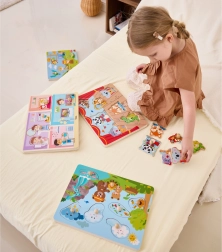 Puslespillet præsenterer farverige dyrefigurer, der spiller på forskellige musikinstrumenter.