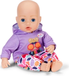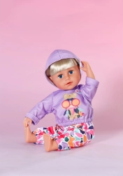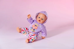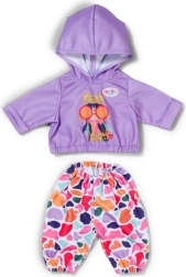 Stilfuldt sæt til dukker i størrelsen 43 cm: lilla hættetrøje med muntert print matcher de farverige bukser for legende kombinationer. Der medfølger også en bøjle af genanvendt materiale. Tøjet understøtter kreativ leg, er nemt at tage på og passer perfekt også til BABY born Teddy.
