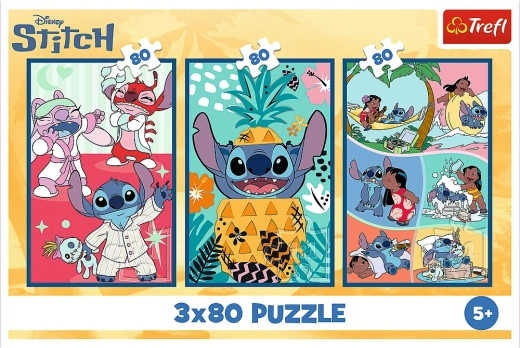 Tre puslespil Lilo & Stitch (3x80 brikker) der vækker nysgerrighed og lærer fantasi. Ideel gave, sikre materialer.