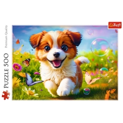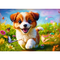 Puslespil Wesoły pejsek består af 500 brikker og forestiller en nuttet hund. Det færdige puslespil måler 480x340 mm.