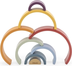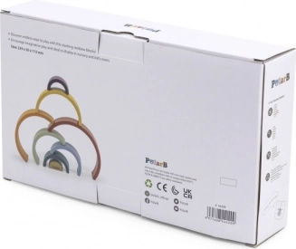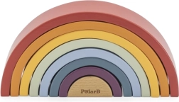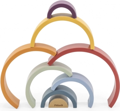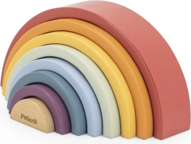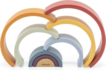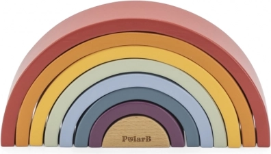 PolarB træregnbuen er et designpuslespil, der vokser med barnet. Syv farvede buer og et indre stykke med logo gør det muligt at bygge regnbuer, broer, indhegninger, baner til biler eller balancetårne. Legen udvikler naturligt fantasi, tålmodighed og rumlig forståelse.