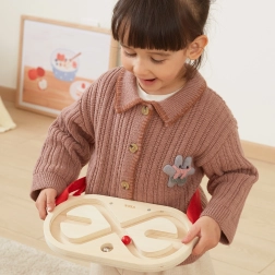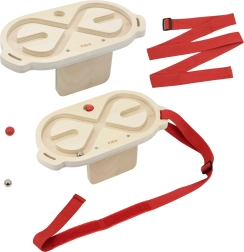 Sættet indeholder to kvalitets-trælabyrinter med glat overflade og to kugler – en lettere trækugle og en tungere metalkugle – til forskellige sværhedsgrader. Takket være de justerbare stropper (46–95 cm) kan labyrinten spændes fast på forskellige dele af kroppen for at træne både balance og præcision i bevægelserne.