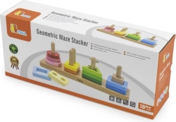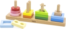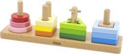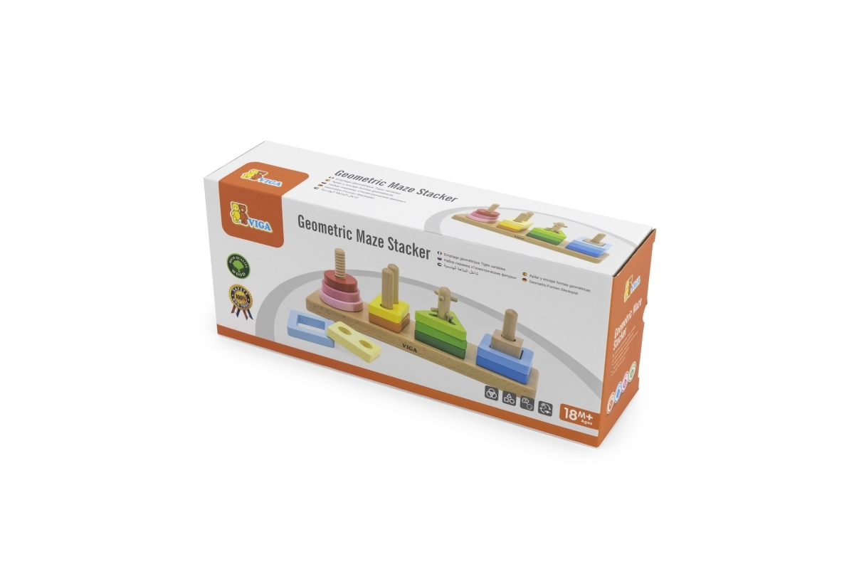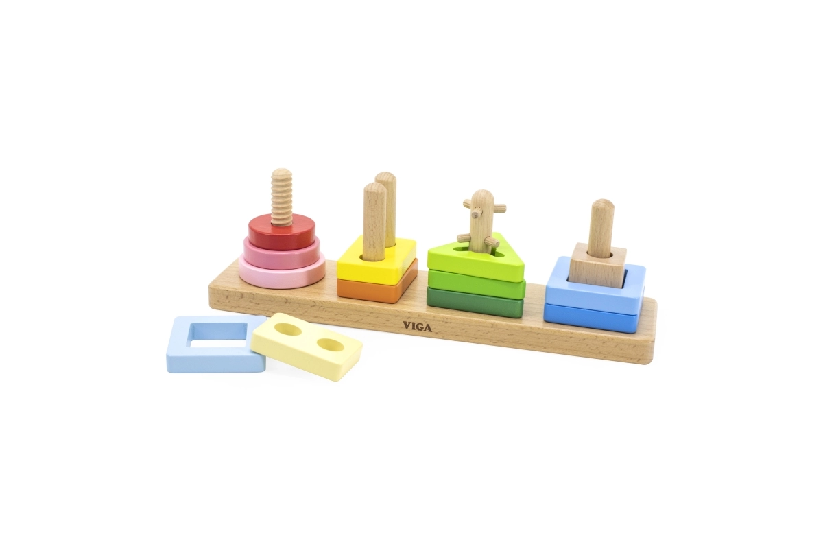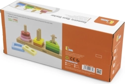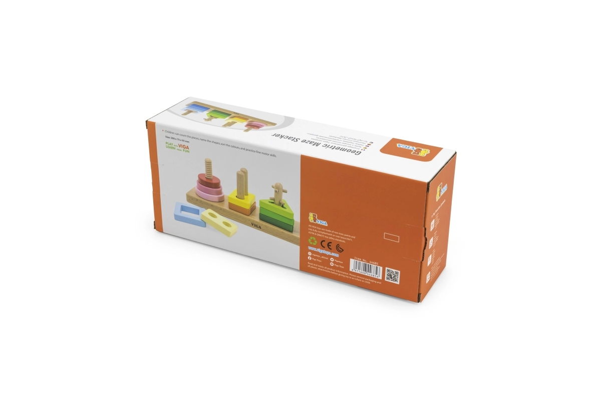 Træ-geometrisk sorteringsspil fra Viga er et pædagogisk legetøj designet til at lære at tælle og skelne mellem former og farver. På hver af de fire grundpinde skal der placeres de passende former. Sjov, der ved første øjekast virker enkel, bliver sværere ved, at klodserne skal tilpasses de tilsvarende udskæringer. Under legen udvikler barnet finmotorik, hånd-øje-koordination og logisk tænkning. Mættede farver fanger barnets opmærksomhed og stimulerer sanserne. Sorteringsspillet har ingen skarpe kanter, og brugen af giftfri maling sikrer sikkerhed for både børn og miljø.