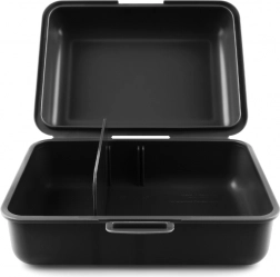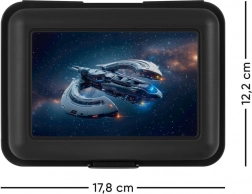 Stilfuld madkasse med rum-motiv for alle fans af kosmiske eventyr. Denne sorte plastkasse er ideel til opbevaring af dine yndlingsretter takket være dens holdbare design.