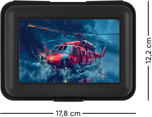 Låget med illustration af en rød helikopter giver madkassen et spændende udseende, ideelt til børn.