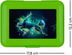 Nyd komfort og stil med denne plastikmadkasse, dekoreret med et dynamisk fodboldmotiv. Den er designet for maksimal funktionalitet og æstetik: