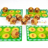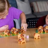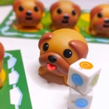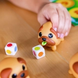 Terninger med farvede slikkepinde bestemmer, hvilke mops du skal finde, hvilket tilføjer dynamik og strategi til spillet.