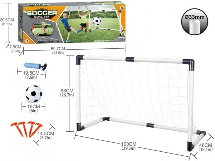 Fodboldsæt til både små og store spillere, som inkluderer et sammenklappeligt mål og en bold. Et fantastisk tilbehør til alle fodboldfans, ideelt til leg i haven eller i parken.