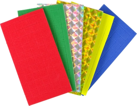 - Sæt af farvede skumkvadrater i 4 farver, 2 glitrende kvadrater (gylden og sølv), forlæg – juletræ