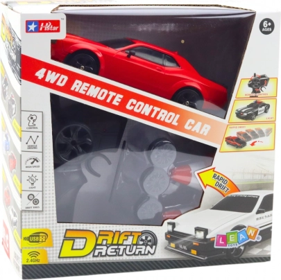 - RC driftbil (rød), 2,4 GHz-controller, batteri med USB-kabel, 4× driftdæk, træningskegler
