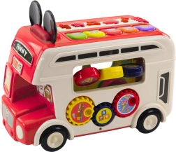 Bussen er udstyret med åbninger til klodser med bogstaver, som barnet kan tilpasse til de tilsvarende steder, hvilket udvikler deres observationsfærdigheder og præcision af bevægelser. På siderne er der roterende mekanismer og interaktive elementer, der giver yderligere sensoriske stimuli og støtter aktiv udforskning.