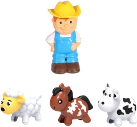 Sættet indeholder plastfigurer af en landmand og dyr, som er lette og tilpasset børns behov for sjov leg på gården.
