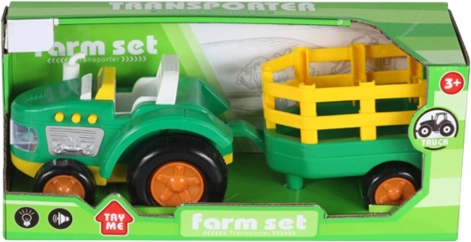 Dette farmersæt indeholder en grøn traktor med gul anhænger samt figurer af en landmand og dyr. Traktoren har et realistisk udseende med lys- og lydeffekter, som vil fascinere enhver lille fan af køretøjslegetøj. Lysene lyser, og lydene aktiveres ved hjælp af knapper på siden af traktoren.