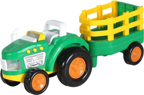 Takket være de bevægelige hjul og den åbnbare anhænger kan børn improvisere forskellige scenarier med landbrug og transport af dyr.