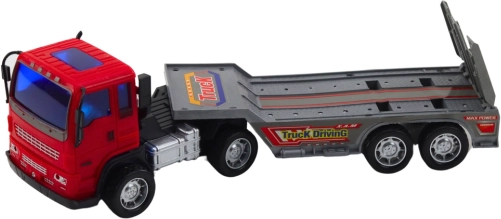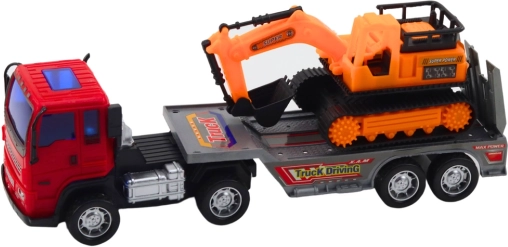 Den røde lastbil med platformanhænger transporterer sikkert graveren – børn kan prøve lastning, losning og kørsel, præcis som på en rigtig byggeplads.