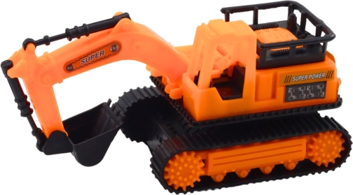 Den orange graver med bælter har en bevægelig arm og skovl, så materialer nemt kan opsamles og flyttes.