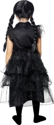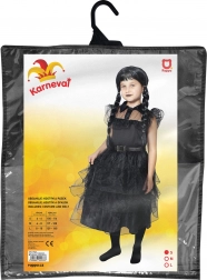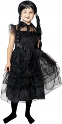 Skab en mystisk stemning til fastelavn og Halloween med dette børnekostume: sort gotisk kjole med romantiske volanter, bælte med spænde og elegant krave. Ideelt til fans af den mørke stil, i størrelse S (4–6 år) og til en højde på 105–116 cm. Paryk medfølger ikke.