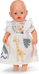 Forkæl din dukke med et stilfuldt sommeroutfit. Den hvide kjole med farverige junglemotiver og en sød giraf har en luftig pasform, fine flæser på ærmerne og er nem at tage på. Perfekt til opfindsom, alsidig og langvarig leg.