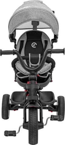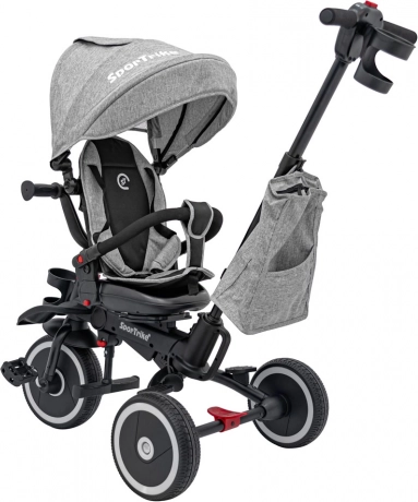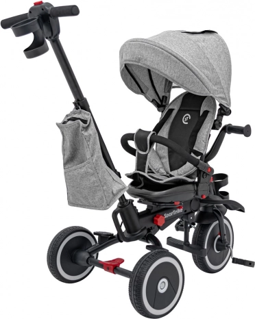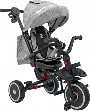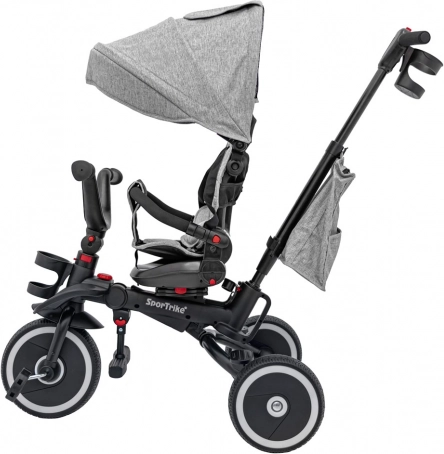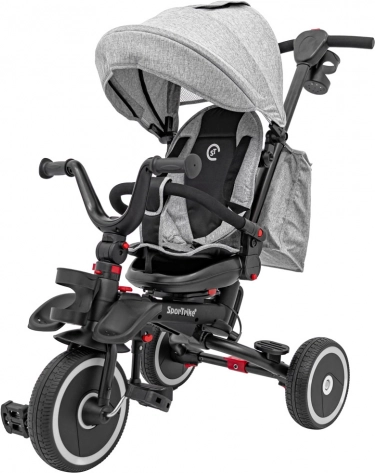 Elegant børnetrehjule SporTrike Rider grå med sikkerhedsseler, justerbart forældrestyr og beskyttende kaleche.