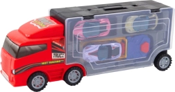 Denne røde lastbil med garage og affyrer er et glimrende valg til børn, der elsker biler, løb og at samle modeller. Den gennemsigtige del af traileren gør det nemt at se de opbevarede biler, og rummene hjælper med orden og selvstændig leg.