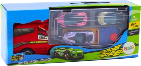 Sjovt sæt til små racerkørere: en rød lastbil med gennemsigtigt opbevaringsrum, praktiske rum og en affyrer, suppleret med tre farverige biler. Mobil garage holder legetøjet pænt samlet, affyrer sørger for lynhurtig start, og holdbar plast lover lang levetid. Ideel derhjemme og på farten.