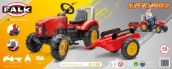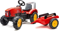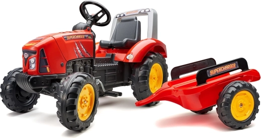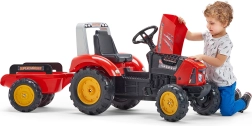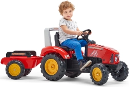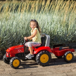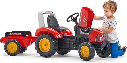 Takket være kædetræk på bagakslen og stabil konstruktion klarer traktoren også mere ujævne underlag. Den aftagelige trailer er ideel til transport af legetøj eller små skatte fra haven. Produktet kræver delvis montering, som klares på kort tid.