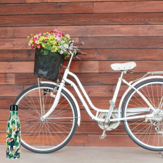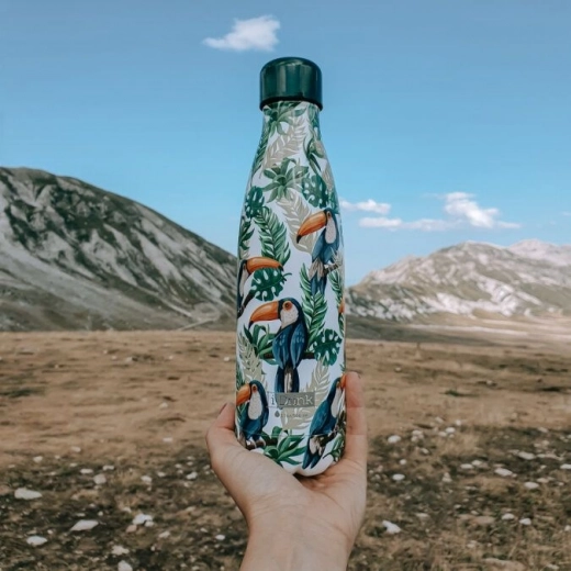 Levende farver og motivet med tropiske blade og tukan gør termoflasken til et iøjnefaldende tilbehør på farten, på arbejde og i skole.