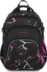 Stilfuld sort rygsæk med marmor mønster og lyserøde lynlåse tiltrækker opmærksomhed med sit moderne udseende og rummelige interiør.