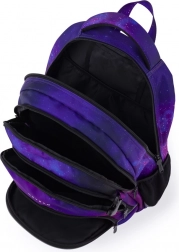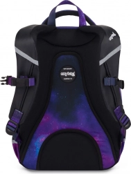 Stilfuld skoletaske med galaktisk motiv, der kombinerer attraktivt design og gennemtænkt ergonomi. Den tredelte indretning rummer bøger, hæfter og madpakke; der er inderlomme, organizer til småting og laptoprum. En sidelomme til drikkedunk og holder til nøgler/chip gør hverdagsbrug nemt.