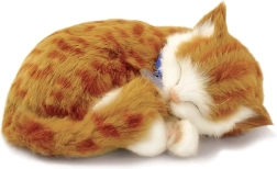 Denne åndende plyskat i rødstribet tabby-udgave virker særligt realistisk – den har blød pels, et sødt halsbånd og hviler roligt i en blød kurv. Den fine bevægelse, der efterligner åndedræt, giver en følelse af ro og tryghed, hvilket gør den ideel som en trøstende ledsager for både børn og voksne.