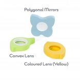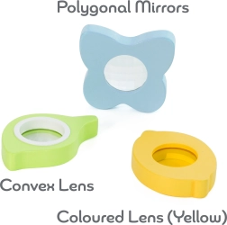 - Indeholder et kalejdoskop og 3 forskellige linser, der ændrer farven, formen og størrelsen på den omgivende verden