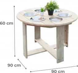 Udforsk sanselegens verden med et rundt, multifunktionelt bord, der kombinerer naturtræ og metalskåle. Børn kan trygt eksperimentere med forskellige materialer – hælde, si, filtrere og sammenligne. Takket være 6 separate stationer er bordet ideelt til fælles leg og læring gennem sjov.
