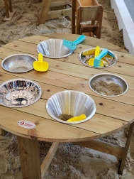 Hver indsats-skål tilbyder en anden aktivitet – fra sigtning over hældning til blanding og sammenligning af materialer. Børn udvikler finmotorik og logisk tænkning gennem leg.