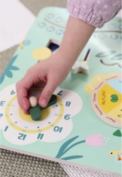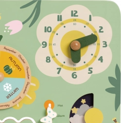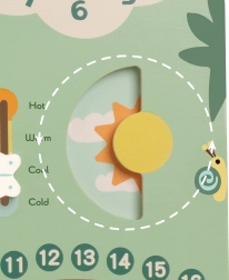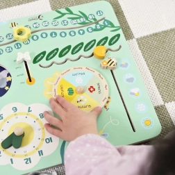 Trækalenderen giver børn mulighed for selvstændigt at indstille dato, måned og årstid, hvilket hjælper med at udvikle deres motoriske færdigheder.