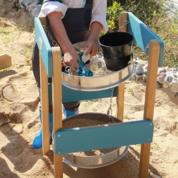 Stationen er nem at samle og klar til intensiv brug. Den understøtter finmotorik, kreativitet og fantasi – børn kan sortere småsten, muslinger eller andre naturmaterialer, udforske teksturer og lave deres egne mini-eksperimenter. Et ideelt supplement til både sand og vand for mange timers leg og læring.