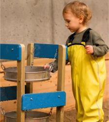 To ophængte metalsier gør det muligt for børn at sammenligne materialer, følge sigteprocessen og forstå årsag og virkning på en legende måde.