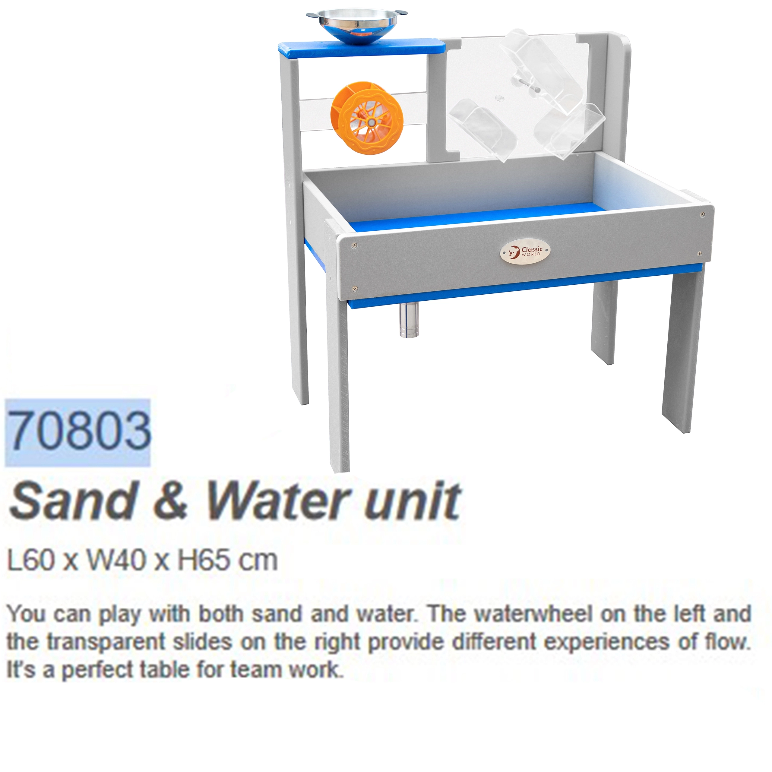 Vand- og sandbord fra Classic World bringer leg med vand og sand til alle børn. Dette innovative og sikre produkt er ideelt til brug i haven, på legepladser eller i pædagogiske institutioner.