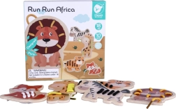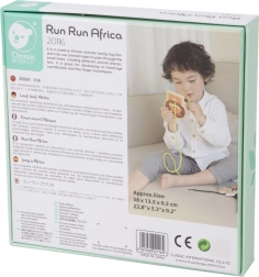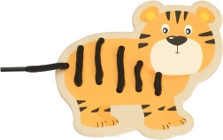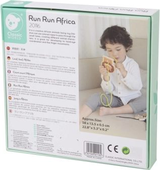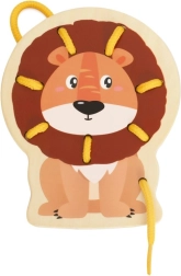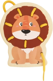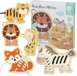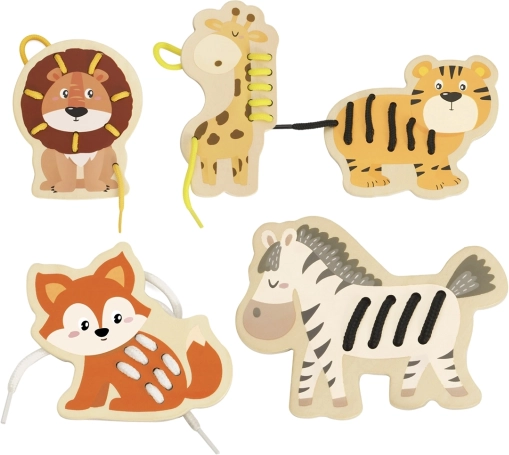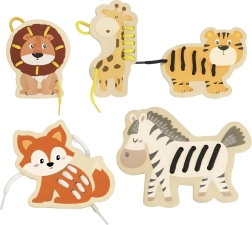 Sættet indeholder 5 dyr fra Afrika (giraf, løve, tiger, ræv og zebra) og 5 farvede snører. De glatte trædele med sikker overflade ligger godt i små hænder, og de livlige farver understøtter farvegenkendelse og navngivning af dyr.