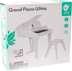 Det hvide børneklaver CLASSIC WORLD giver en autentisk spiloplevelse på et rigtigt instrument i et sikkert og legende format. Takket være trækonstruktionen, den stabile skammel og nodestativet får små musikere en komfortabel siddestilling og gode vaner ved spil. En illustreret nodebog medfølger for at gøre de første melodier lettere.