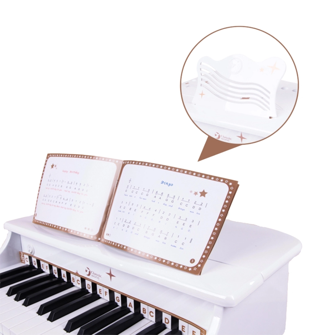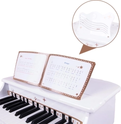 Små musikere kan spille som på et rigtigt klaver – med en behagelig skammel, nodestativ og tydeligt markerede tangenter for let indlæring.