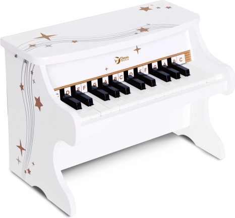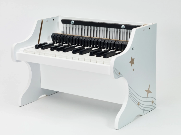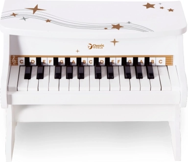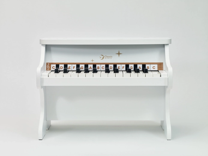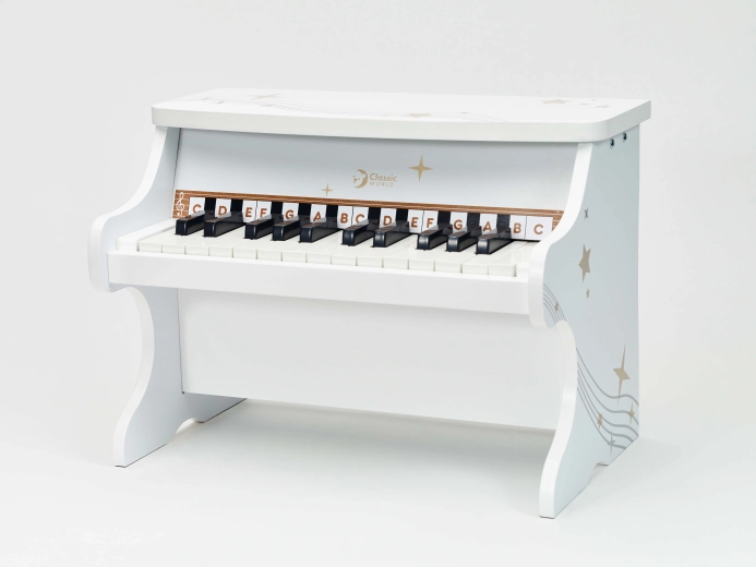 Børneklaveret CLASSIC WORLD er omhyggeligt fremstillet af træ og lakeret med en ikke‑giftig overflade i hvid. Den realistiske udformning og den rene tone bringer en autentisk musikalsk oplevelse tættere på og opmuntrer børn til at udforske melodi og rytme.